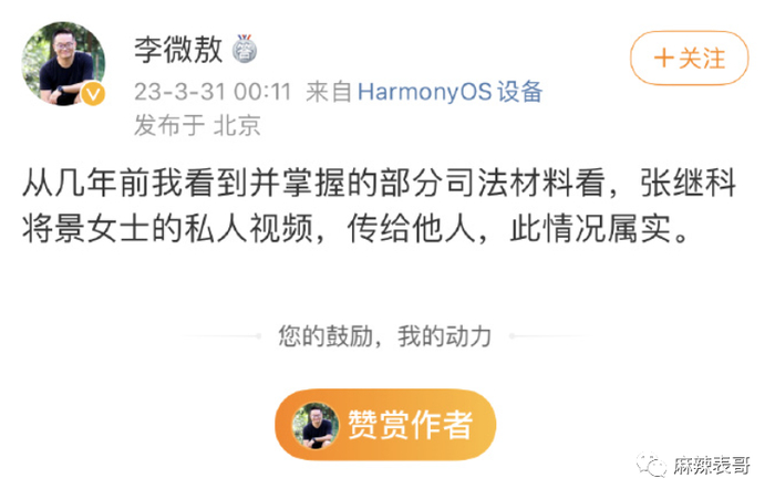 2023年3月,一名名叫李微敖的网友发文,也不是说我听说什么什么,而是直接说来源是“司法材料”,“张继科将景甜女士的私人视频,传给他人,情况属实”。