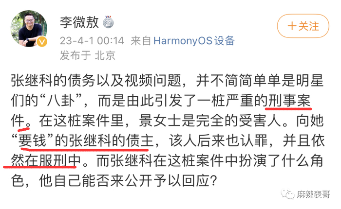 4月1号凌晨,李微敖又发文,这是刑事案件,不是八卦事件,张继科的债主还拿视频找景甜“要钱”,现在依然在服刑。