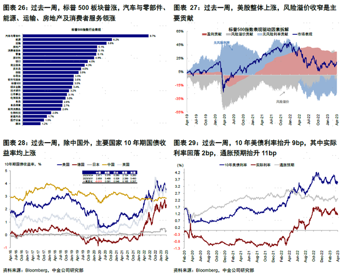 ►资产表现:大宗>股>债;美股反弹,原油大涨。本周市场对欧美银行业危机继续蔓延的担忧减缓,风险偏好改善带动欧美股市反弹。周二参议院听证会中,美联储副主席巴尔表示“监管方将根据需要为任何规模的银行使用工具以确保所有存款的安全” ,同时拜登表示银行业危机尚未结束,呼吁加强监管,增加资本压力测试的次数。临近周末,超预期回落的2月核心PCE推升了市场对加息接近尾声的信心,受此影响美债利率再度回落至3.5%以下,美股上涨,成长风格领先。大宗商品方面,得益于供应收紧、EIA原油库存回落等因素,原油大涨6%。