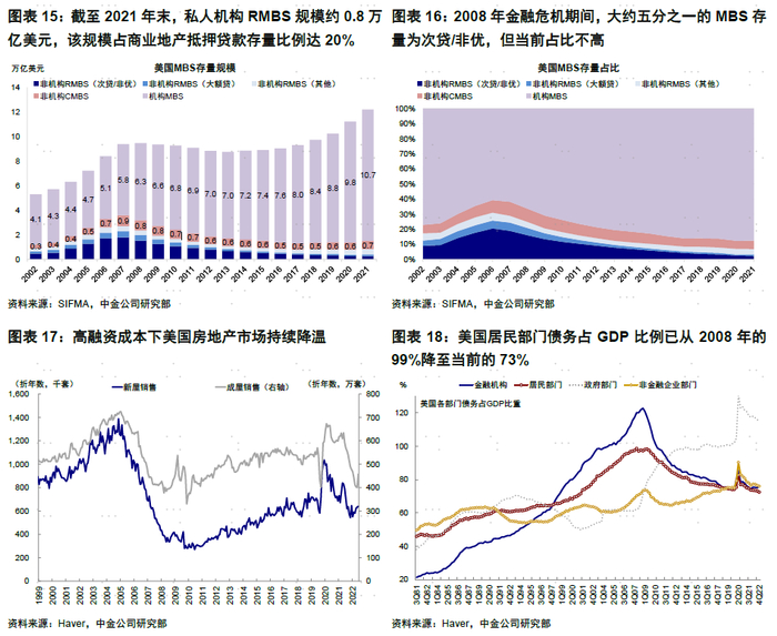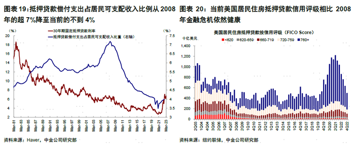 ►银行持有住房抵押贷款比例不高;且住房抵押贷款的相比金融危机前的风险较低。在住房抵押贷款利率的快速抬升(当前30年期及15年期住房抵押贷款利率分别达6.3%和5.6%;去年11月一度突破2008年金融危机高点),以及美国房价及购房需求持续降温的背景下,虽然行业整体存量较高,但银行持有占存量不高且资产质量更为健康。具体来看:1)当前向没有偿付能力的借款人提供贷款的情况已经没有那么普遍。2008年金融危机之前,投资者进入美国房地产市场的最简单方法之一是购买 MBS,其中大约五分之一是当时的次贷/非优(Subprime/Nonprime),但当前占比很低(且银行的持有占行业存量比例仅16%)。2)当前美国居民部门整体杠杆及房贷杠杆均不高。(居民部门2008年金融危机后去杠杆明显,债务占GDP比例已从2008年的99%降至当前的73%、抵押贷款偿付支出占居民可支配收入比例从2008年的超7%降至当前的不到4%)。3)当前美国居民房贷信用评级(FICO Score)较为健康。(FICO Score在760+占比仍达62%vs. 2008年金融危机爆发前的23%)。