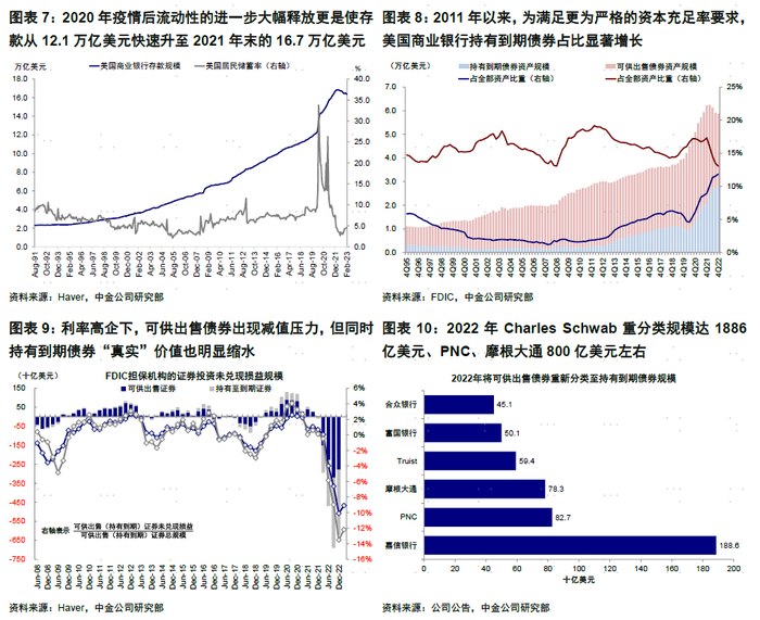 商业银行持有证券主要可以分为可供出售债券和持有到期债券,两者的区别在于是否直接会将价格的波动体现在账面价值上。不过,如果面临类似于近期的突发流动性压力迫使银行需要提前抛售的话,这些未直接提前在账面上的“未兑现损失”也就会变成实际损失,近期硅谷银行便是如此。