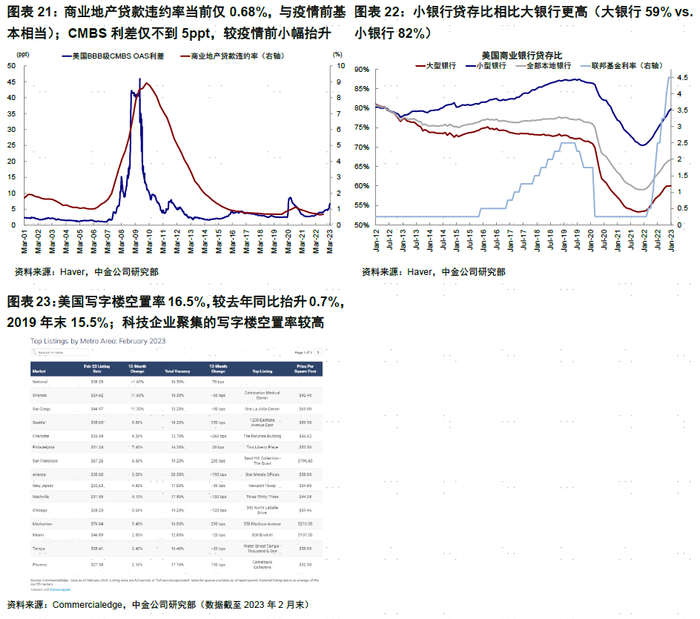 无论从商业地产贷款违约率(当前仅0.68%,与疫情前基本相当)、CMBS利差上升幅度(当前仅不到5ppt,较疫情前小幅抬升)、以及商业地产空置率(CommercialEdge统计的高频数据显示截至2月末美国写字楼空置率16.5%,较去年同比抬升0.7%,2019年末15.5%;科技企业聚集的写字楼空置率相对较高,如西雅图和旧金山分别达18.2%和19.2%)来看整体风险可控,但小银行对商业地产贷款敞口更大,因此风险敞口较高,值得关注。