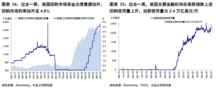 ►流动性:在岸及离岸美元流动性紧张均缓解。过去一周,FRA-OIS利差回落至33bp,美国投资级和高收益债信用利差均收窄。欧元、日元、瑞郎与美元3个月交叉互换收窄。银行业存款持续流出至收益率较高的货币市场基金,推升美国主要金融机构在美联储账上逆回购使用量,当前使用量为2.4万亿美元/天。