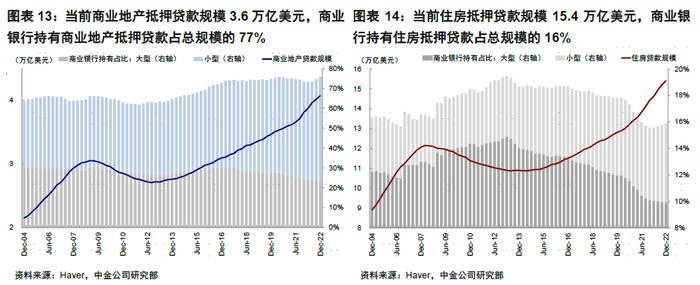 ►相比之下,银行持有商业地产贷款更高,且私人机构CMBS占存量规模超20%。商业地产抵押贷款规模虽然远不及住房抵押贷款,但商业地产贷款持有占存量比例很高,私营部门CMBS占存量比例达20%,也可能使得银行对该部分的暴露更多。具体来看:1)银行持有占存量比例很高(银行持有商业地产抵押贷款规模占存量比例达77% vs. 住房抵押贷款的16%;其中大银行持有24%、小银行持有43%);2)商业地产贷款占银行全部贷款及全部资产中比例较金融危机后未出现回落。银行持有商业地产抵押贷款占全部贷款及全部资产比例金融危机前为27%和16%、当前为25%和14%;但持有住房抵押贷款占全部贷款和全部资产比例金融危机前35%和20%、当前为23%和13%;3)私人机构CMBS规模0.7万亿美元,在商业地产抵押贷款全行业存量中占比明显更高。私人机构CMBS规模约0.7万亿美元,私人机构RMBS规模约0.8万亿美元,二者体量基本相当,但私人机构CMBS规模占商业地产抵押贷款全行业存量比例达20.3%,私人机构RMBS占比仅5.8%。