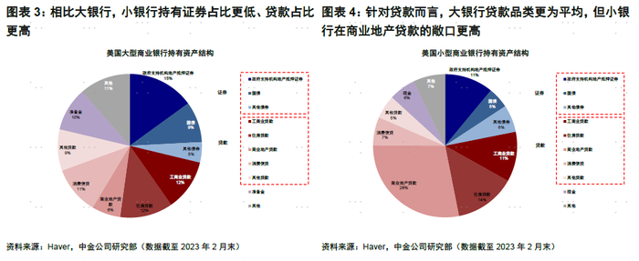 美国商业银行持有金融资产20万亿美元,其中贷款占六成、证券占三成。相比大银行,小银行持有的证券占比更低、贷款更高,且贷款中商业地产贷款占全部贷款比例达五成。