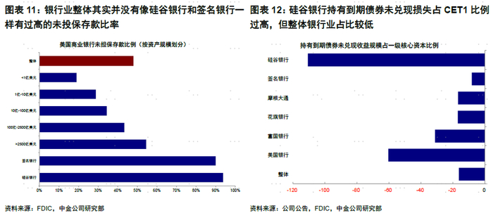 银行风波出现后,美联储及时提供短期流动性可以在短期内缓解部分银行被迫出售持有到期债券的压力。近期部分银行破产事件发生后,美联储及时介入部分缓解了流动性缺口避免银行需要不断抛售资产,如最新设立的银行定期融资计划,BFTP,《美联储重新“扩表”了么?》)。当然,在主要银行中,资产端未兑现损失占比较高(占一级核心资本)与负债端流失压力较高的银行风险较高,但整体并非如此:1)整体未投保存款比率不高,硅谷银行、签名银行未担保存款分别约占94%、90%vs. 银行业整体48%;2)整体银行业未兑现损失占CET1比例不高,硅谷银行持有到期债券未兑现损失占其一级核心资本比例超110% vs. 整体仅约16%。