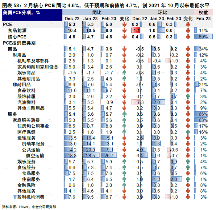 ►基本面与政策:2月核心PCE同环比回落幅度超预期。美国:2月核心PCE同环比回落幅度超预期。2月PCE同比上涨5%,低于预期的5.1%和修正后前值5.3%;核心PCE同比4.6%,低于预期和前值的4.7%,创2021年10月以来的最低水平,环比0.3%,低于预期的0.4%和修正后前值0.5%。分项来看,商品项环比普遍回落,机动车及零部件回落明显,仅服饰鞋履分项小幅上升;服务项中运输服务环比自0.9%回落至0%,但娱乐服务、食宿服务价格仍具韧性,环比均抬升。