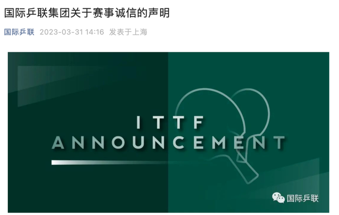 对此,3月31日,据WTT世界乒乓球职业大联盟消息,国际乒联集团关注到近期有关国际乒联、WTT世界乒联赛事诚信的传闻,特发表如下声明: