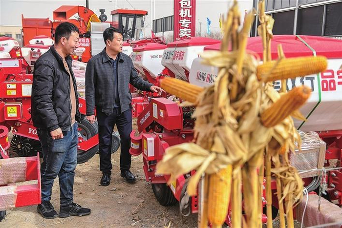 吉林省四平市梨树县是全国产粮大县。眼下正是备耕时期,梨树县市场监督管理局、农机推广总站等部门深入农资、农机生产和销售领域,规范市场经营秩序,全力保障备耕生产顺利进行。图为在梨树县一家农机销售公司,梨树县农机推广总站站长张志刚(右)向经销商询问农机销售情况。 新华社记者 张 楠 摄