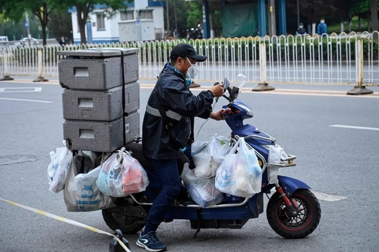 2022 年 5月10 日,北京。一名盒马鲜生骑手正在送货。(图 / 视觉中国)