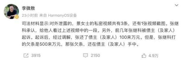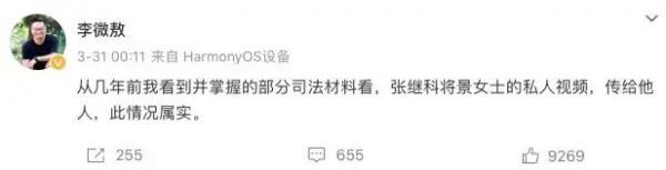 该声明发出后,3月31日,李微敖就此事发布多条微博。他声称,他从几年前看到并掌握的部分司法材料得知,“张继科将私人视频,传给他人,此情况属实。”