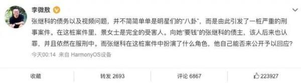 4月2日,@李微敖 在微博和微信公众号发布文章回应此前发布关于张继科言论的来龙去脉。李微敖表示他在2020年知道张继科先生此事,并做过比较长时间的调查采访。因3月30日看到“张继科工作室”不承认此事,还威胁要起诉网友,遂愤而发声。并表示如被起诉会迎难而上,认真积极应对。如果他的文章给明星某女士带来了新的麻烦和困扰,向其表示诚恳的歉意。