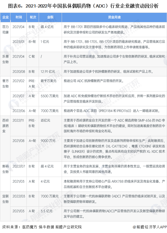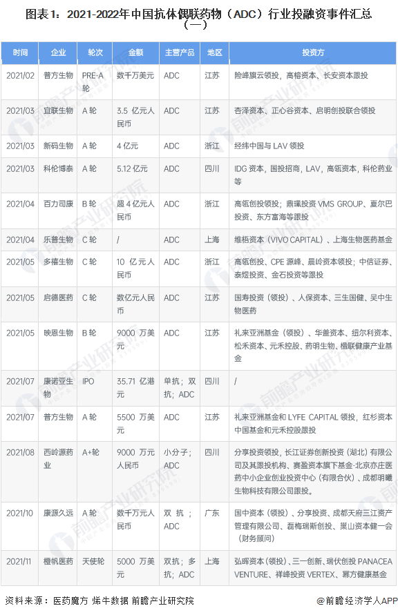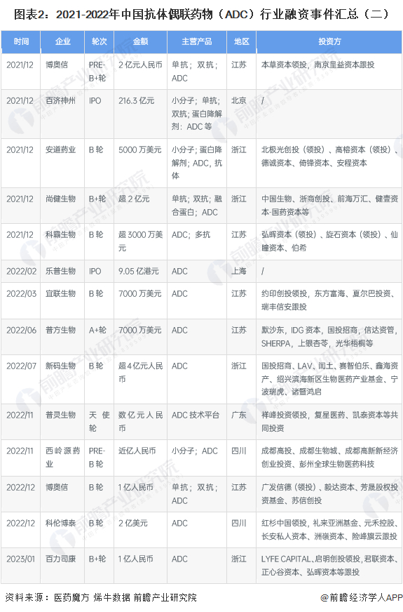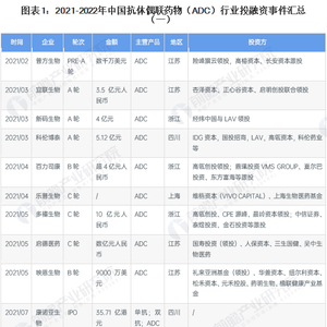 抗体偶联药物是近几年兴起的行业赛道,截至目前全球仅15款ADC药物获批上市,2021-2022年的我国抗体偶联药物(ADC)行业的主要投融资事件如下: