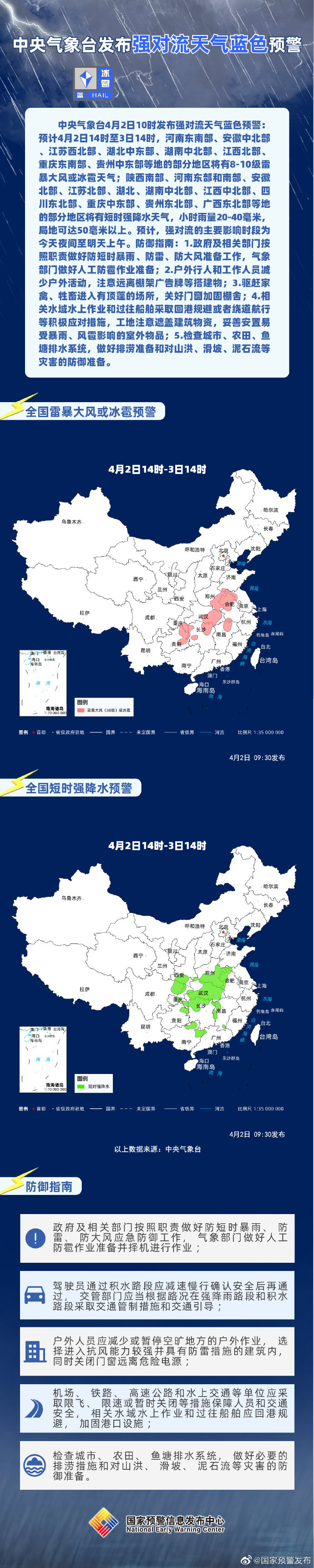 中央气象台4月2日10时发布强对流天气蓝色预警:预计4月2日14时至3日14时,河南东南部、安徽中北部、江苏西北部、湖北中东部、湖南中北部、江西北部、重庆东南部、贵州中东部等地的部分地区将有8-10级雷暴大风或冰雹天气;陕西南部、河南东部和南部、安徽北部、江苏。