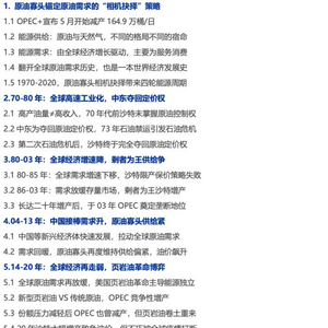 因此,目前OPEC产量策略的“相机抉择”特征在历史四轮能源周期中也同样明显,本文旨在从四轮能源周期出发,研究OPEC产量策略调整的一般规律,更清晰的为后续原油供给侧变化以及油价趋势判断做参考。