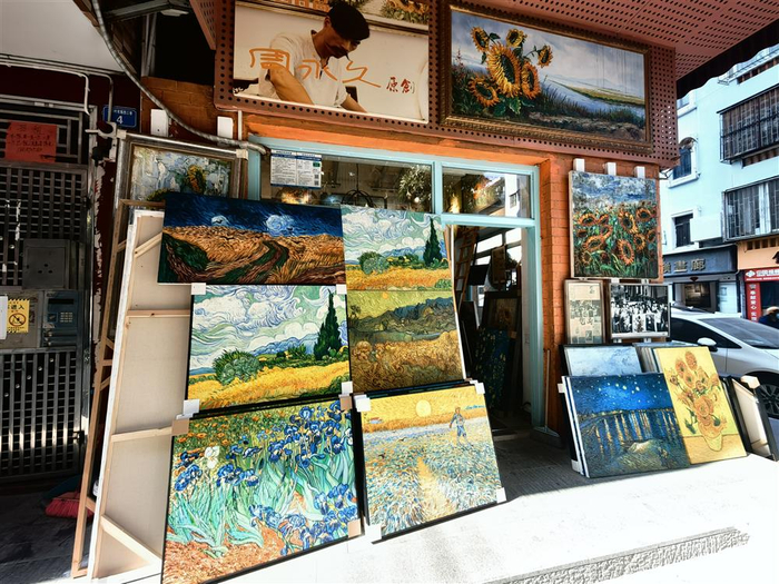 从小在这长大的周甘雨形容,大芬村“像一个肺”,中心的美术馆和广场就是肺泡,向四周延伸的小巷则是毛细血管。在这里,有成百上千家类似的店铺,大多是家庭作坊,它们拥挤地排列着,随便走进一个总能看到雷同的画作,高山、瀑布、星空、向日葵。外来者一旦钻进去,就分不清南北。