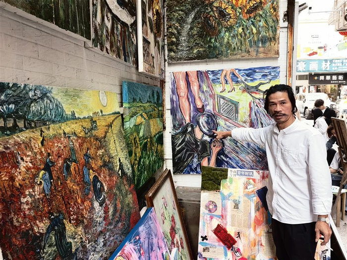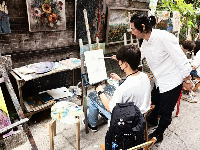 母女俩离开后,七拐八绕,又走进了周永久的工作室。女孩向周永久展示了自己用丙烯颜料画的梵高,周永久看了之后,停顿片刻说:“我已经在画原创了。”
