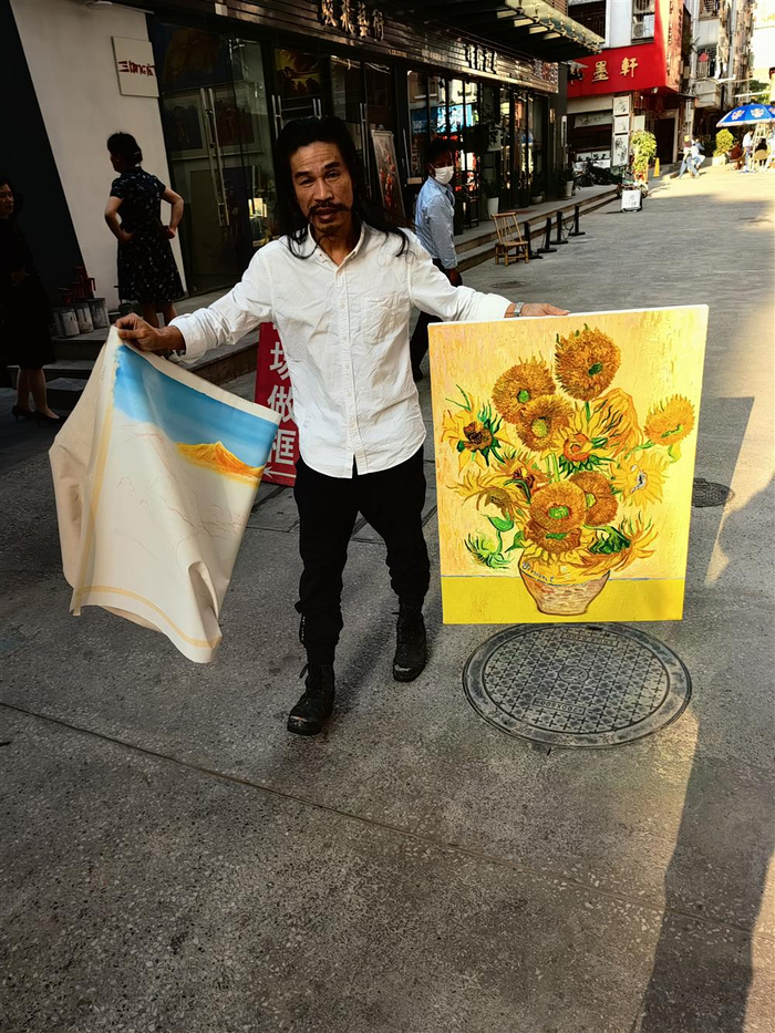 回到深圳后,他把这幅画放在店外。时至今日,他记不清那个来问价的是意大利人还是澳门人,也说不准当时报的是150元还是200元,总之,那是个随口一报的数字,比边上那幅临摹梵高的向日葵要贵一些。
