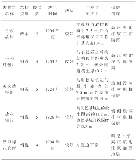 长江隧道上方多为繁华路段,沿线文物较多。图 8 、图 9 给出了鲁兹故居和平和打包厂的加固示意图。表 3 列出了隧道与周围保护建筑物的关系及处理方法。