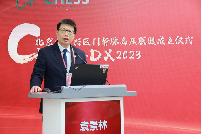 图片说明: 2023年4月1日,北京市大兴区门静脉高压联盟正式成立,大兴区辖区内25家社区医院和医疗机构全部成为该联盟成员单位。图为北京市大兴区人民医院副院长袁景林在此次会上发表题为《区域医疗中心建设,助力分级诊疗落地》主旨演讲。