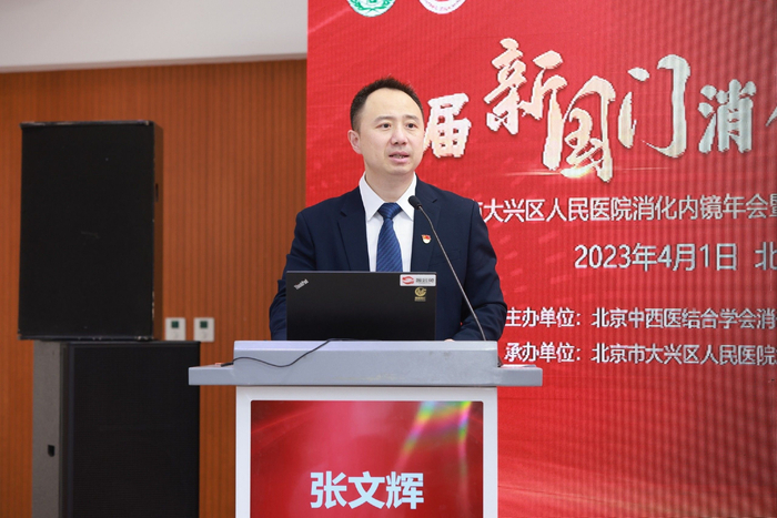 图片说明:2023年4月1日,北京市大兴区门静脉高压联盟正式成立,大兴区辖区内25家社区医院和医疗机构全部成为该联盟成员单位。图为北京市大兴区人民医院消化内科主任、副主任医师张文辉在主持该联盟成立仪式。