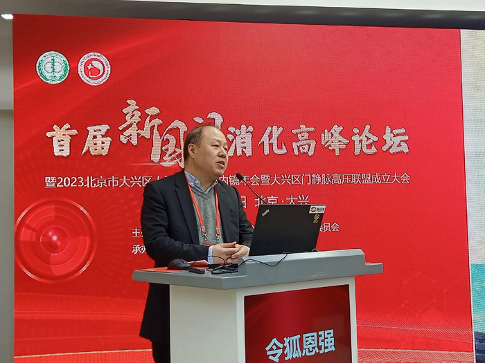 图片说明: 2023年4月1日,北京市大兴区门静脉高压联盟正式成立,大兴区辖区内25家社区医院和医疗机构全部成为该联盟成员单位。图为解放军总医院消化内科医学部主任令狐恩强在首届“新国门”消化高峰论坛上作学术报告,该论坛由北京中西医结合学会消化内镜学专业委员会主办,北京市大兴区人民医院消化内科承办,该活动旨在促进中国在消化内镜学领域的新进展、新成果的学术交流,推动中国消化内镜事业发展。