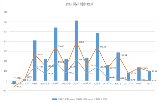 而2022年全年,碧桂园的归属净利润和少数股东损益更是出现了一正一负的相反走势,归属净利润和少数股东损益形成了一个十分鲜明的剪刀差,这也是其2004年来的首次。