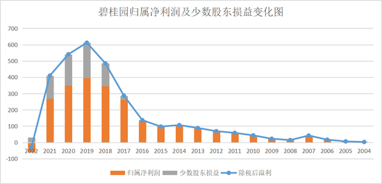 从碧桂园2004年以来的财报可以看出,在发展初期其少数股东损益并不高,甚至可以忽略不计,而在2015年以后,情况发生了变化。