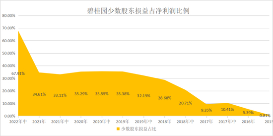 2015年以后,碧桂园的净利润飙升,其中少数股东损益占比也同步增长,从2015年的0.81%上涨至2019年的35.38%,此后总体保持这一水平,直至2022年,2022年上半年,碧桂园整体还处于盈利之中,此时其少数股东损益已经超过了归属净利润,占比达67.91%