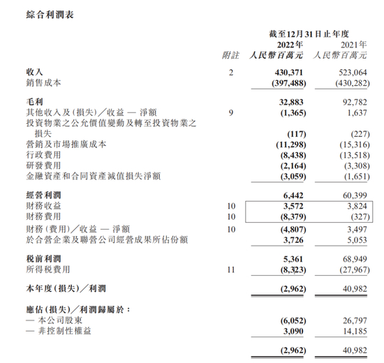 2022年,碧桂园实现总收入约为人民币4303.7亿元,同比下滑17.7%;毛利约为人民币328.8亿元,归属净利润亏损60.52亿元,止盈转亏,去年同期净利267.97亿元。