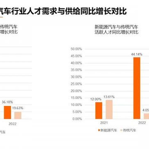 2022年新能源汽车职位增速约为传统汽车的2倍,活跃人才增速约为其11倍