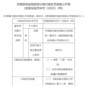中国经济网北京4月3日讯 银保监会网站今日公布的河南银保监局安阳分局行政处罚信息公开表(安银保监罚决字〔2023〕2号、3号)显示,中原银行股份有限公司安阳铁一路支行(原洛阳银行股份有限公司安阳分行)贷款“三查”不到位;未经任职资格核准实际履行高管职责。