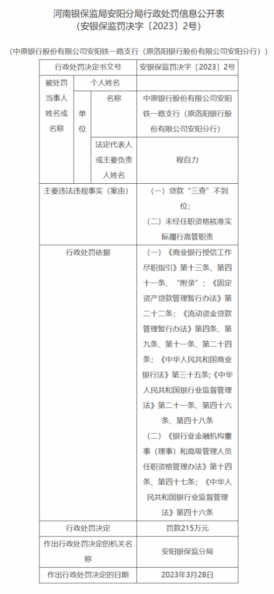 安阳银保监分局依据《商业银行授信工作尽职指引》第十三条、第四十一条、“附录”;《固定资产贷款管理暂行办法》第二十二条、《流动资金贷款管理暂行办法》第四条、第九条、第十一条、第二十四条;《中华人民共和国商业银行法》第三十五条;《中华人民共和国银行业监督管理法》第二十一条、第四十六条、第四十八条;《银行业金融机构董事(理事)和高级管理人员任职资格管理办法》第十四条、第四十七条,对中原银行股份有限公司安阳铁一路支行罚款215万元;对程自力警告。