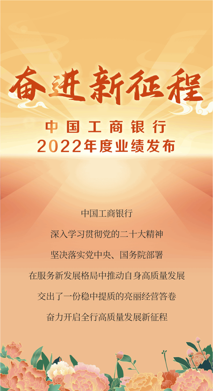 2023年3月30日,中国工商银行公布了2022年经营情况。工商银行通过贷款、债券、租赁、投资等工具,为实体经济提供资金支持超过6.4万亿元,资本充足率达到19%以上,保持市场领先;拨备覆盖率稳定在200%以上,资产拨备余额近8000亿元(人民币,下同),风险抵御能力增强;不良贷款率降至1.38%,资产质量保持稳健。总资产增加至近40万亿元;实现营业收入8400亿元;净利润突破3600亿元,增速3.1%。