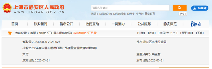 中国质量新闻网讯 据上海市静安区人民政府网站2023年3月31日消息,2022年静安区市场监督管理局对辖区内销售的非医用口罩产品进行了监督抽查。