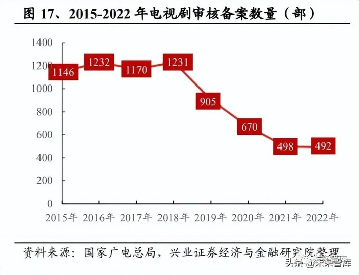甲种制作机构减少,剧集行业加速出清。从事电视剧制作业务机构需要取得《电 视剧制作许可证》作为经营资质,其中“甲种”要求制作机构在两年内完成 6 部 以上单本剧/3 部以上连续剧(每部 3 集以上)才可换发/申请。经历 2017 年以来 的严格监管、疫情冲击等不利因素的影响下,行业步入理性阶段,机构出清明显。据国家广电总局披露,2021-2023 年持证机构仅 41 家,较 2019 年下滑 44%,对 比 2010-2016 年均在 130 家以上,剧集备案数量由 2018 年及以前的 1000 余部缩 减至 2021-2022 年的 500 部以下,发行总量由 300 余部降至 200 部以下。