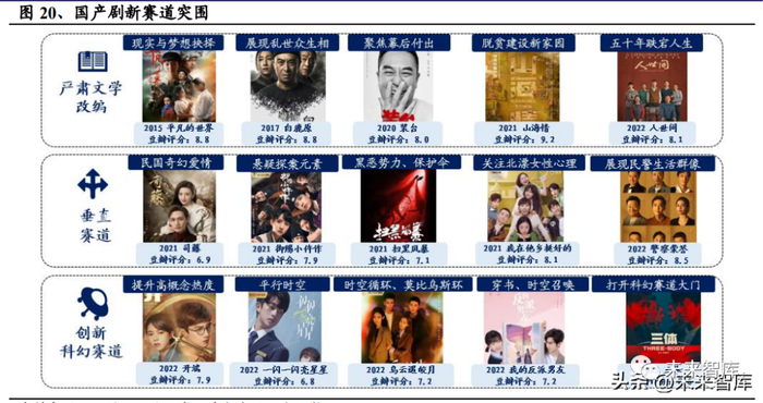 跳脱原有路径,新颖赛道突围。作为内容制作行业,其长期成长离不开内容创新。上游制作公司持续积极尝试打破题材局限,开辟新赛道。严肃文学价值凸显,不 同于热门小说 IP,严肃文学改编剧集品控要求较高且市场风险较大,目前市场上 虽仍然较为少见,但已有团队进行了有益尝试,如 2015 年《平凡的世界》、2017 年《白鹿原》、2020 年《装台》、2021 年《山海情》、2022 年《人世间》等,成功 的严肃文学改编作品不仅收获了口碑与热度,且具有深厚人文精神,能够给观众 带来更加深刻的思考与沉淀。垂直细分赛道佳作,往往能够凭借生动的故事和新 颖的题材设置突围,获得优质口碑,如《司藤》《御赐小仵作》《扫黑风暴》《我在 他乡挺好的》《警察荣誉》分别针对民国奇幻、爱情悬疑、扫黑除恶、北漂女性、 基层民警等垂直圈层实现成功突围。科幻题材表现突出,2022 年以高能《开端》, 同时期的《一闪一闪亮星星》凭借平行时空概念收获大量关注,后续的《乌云遇 皎月》《我的反派男友》也加入了莫比乌斯环、穿书等奇幻元素,2023 年科幻剧 《三体》上线,其作为备受瞩目的世界级科幻 IP,让世界看到中国科幻的影像魅 力。