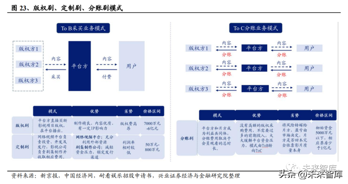 总体而言,在上游影视制作行业加速出清与中游平台降本增效的背景下,头部版 权剧议价主动权凸显,而分账剧、定制剧模式也成为内容多元增值的利器。内容 制作与内容平台的多元合作模式为不同定位、赛道和体量的内容提供了有效变现 的路径。