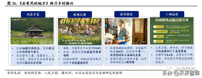 弘扬主流价值观,提升作品观赏性。在对主题创作的鼓励推动下,优秀的主流价 值影视作品能够同时发挥其商业价值和艺术观赏性,摆脱说教高台、真切贴近民 生、反映社会现实。针对社会反响好的作品,广电总局会积极帮助其宣传推广、 召开研讨会深挖其正向价值,树立行业典型标杆。因此,能够把“主流”做成“顶 流”的公司,在现如今的文化政策下更具竞争主动权。促进文旅融合,助力乡村振兴。近期广电总局出席参与了由中国电视艺术委员会 主办的电视剧《去有风的地方》研讨会,该剧主打都市田园慢生活,重视细节与 质感,凭借美好画卷给观众带去共鸣与治愈感,领跑 1 月云合、CSM 等多个榜 单;带火剧集拍摄地云南,促进影视和文旅融合发展;此外,该剧关注到了留守 儿童、孤寡老人、人口流失、传统手艺传承等易被忽视的现实社会问题,得到总 局的高度认可。