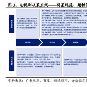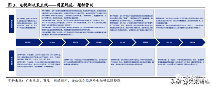 多条主线政策引导,促进行业健康发展。精品化方面,“一剧两星”、“防注 水”等推动全行业开启减量提质。备案制度方面,管理更加规范化和标准化, 台网全面提升创作生产质量要求。明星规范方面,对从业人员的管理加强,严 打偷逃税、天价片酬、泛娱乐化等乱象。题材管制方面,重大会议及纪念日等 期间禁止播出娱乐性较强的古装剧、偶像剧等,鼓励主题创作、丰富题材发展。