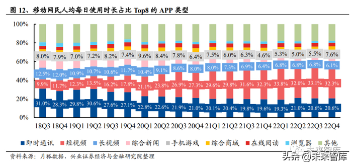 观众需求:短视频挤占减弱,长视频刚需显现。2016 年以来,由于恰好满足用户 碎片化的内容需求,短视频软件的兴起给包括长视频在内的内容消费形式带来竞 争压力。按照人均每日使用时长计算,短视频所占份额已从 2018 年的 10%上下增 加至目前的 30%以上。但短视频流量红利已出现见顶态势,用户时长占比 2022Q4 同比 2021Q4 持平,预计未来保持平稳。截至 2022Q3,长视频使用时长占比连续 三季度维持在 6.80%,用户刚需显现,2022Q4 受内容排播影响,长视频使用时长 占比减少至 6.1%,预计后续将有所回升,各赛道格局有望稳固。