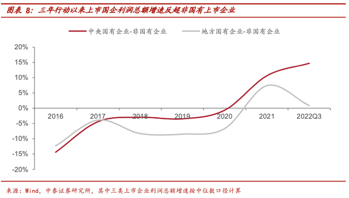 2020-2022年国企改革三年行动中,国有企业国民经济“稳定器”、“压舱石”的作用不断凸显。按照中位数口径计算,当前上市国企利润总额增速已经反超非国有上市企业,其中上市央企的增速提升效果较地方上市国企更为明显。
