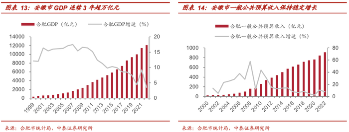 更为重要的是,在产业链带动方面,通过发挥国有资本的引领作用,合肥政府逐步构建起了以“芯屏汽合”、“集终生智”为代表的几十条特色产业链,直接带动合肥市GDP连续3年超万亿,2008-2022年15年间,全市一般公共预算收入翻了5.6倍,实现城市能级的巨大跃升。