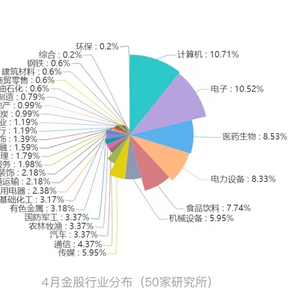 从金股行业推荐度来看,TMT持续火热蔓延到4月,电力设备、机械设备等近月来的热门板块被“压下一头”。据每市APP统计,计算机行业成为4月金股分布最多的板块,金股数量占比达到10.71%;电子行业、医药生物则位列金股分布数量第二、第三行业,占比分别为10.52%及8.53%。值得一提的是,作为计算机、通信之外的TMT行业,传媒板块推荐度大幅跃升约175%。