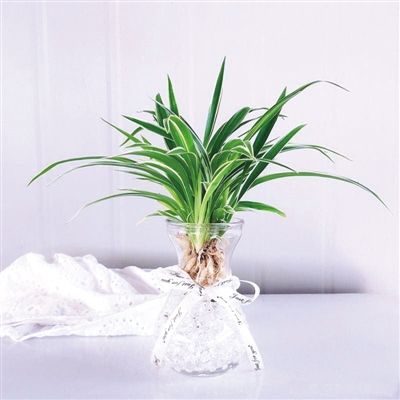 家庭水培首选的就是吊兰,金边吊兰、青叶吊兰等品种都是可以水培的,只要选择自己喜欢的品种就可以。吊兰还有净化空气的作用,水培的方法也很简单,选择吊兰植株上长出来的吊兰“小崽”,等吊兰小崽的气生根长到3厘米左右把它剪下来,放在水培容器中,没有水培容器的可以放在一次性杯子或者玻璃杯中,把大部分气生根浸泡在水中,水量不要没过吊兰的根系,平时水少了就加点水,放在家里有散射光的位置,水培一周左右,就能长出白花花的根系。