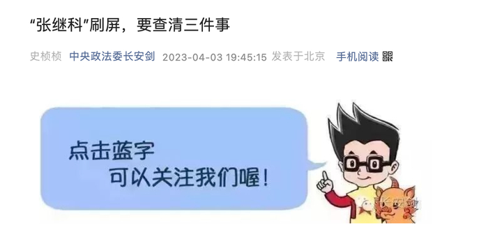 4月3日晚间,中央政法委长安剑公众号发布文章《“张继科”刷屏,要查清三件事》,文章评论道: