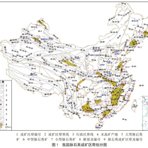 根据成矿区带划分方法及我国区域地质背景资料,可划分为东秦岭-大别、安徽旌德-青阳-浙江安吉、武功山-武夷山-赣南隆起、上扬子东部-龙门山-大巴山(陆缘坳陷)、东海-赣榆、鲁西隆起等16个脉石英成矿区带。