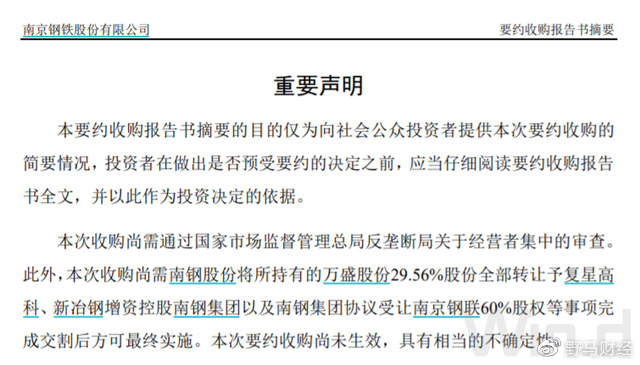 不过,依据公告,本次收购尚需通过国家市场监督管理总局反垄断局关于经营者集中审查。此外,南钢股份要将将所持万盛股份(603010.SH)29.56%股份全部转让予复星高科,新冶钢增资控股南钢集团等事项完成交割。