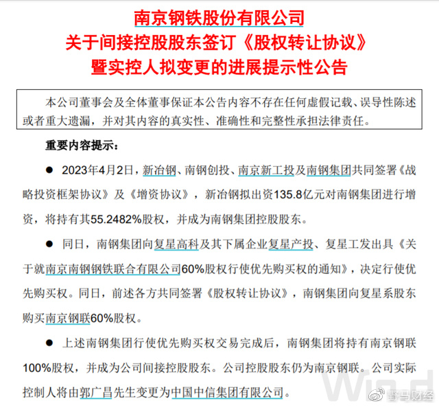 与此同时,复星国际(0656.HK)也公告指出,南钢集团决定行使优先购买权,复星国际已与南钢集团签订协议,以135.8亿元向其出售南京南钢钢铁联合有限公司(简称:南京钢联)60%的股权。