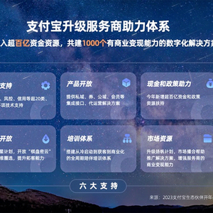 为了更好助力服务商生态的活跃和生意的增长,支付宝平台宣布,将投入超百亿元资金资源专项助力:服务商可获得技术支持、产品开放、现金和政策助力、流量开放、培训体系、市场资源等6大支持,贯穿从冷启动到深度运营,再到规模化变现的全过程;计划共建1000个有商业变现能力的解决方案,帮服务商有效推动GMV和订单数增长。